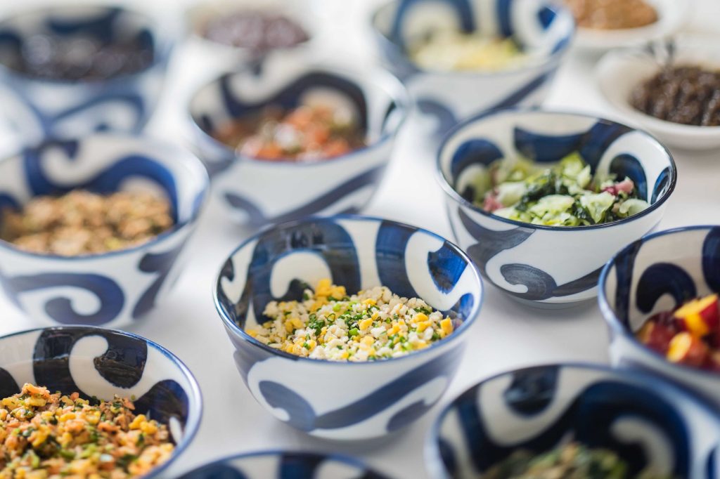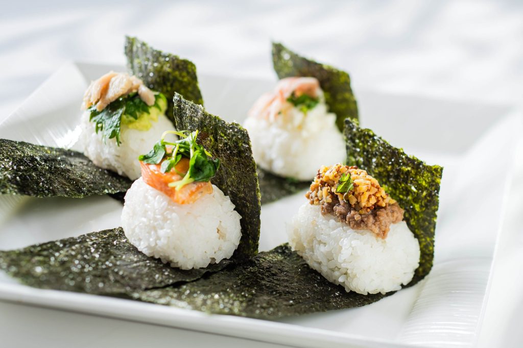 鮭キャベツ、生ハムおかか、梅アボカドチキンに加え、ANAクラウンプラザホテル松山限定の「伊予牛しぐれ煮とマスタードナッツ」お楽しみいただけます。